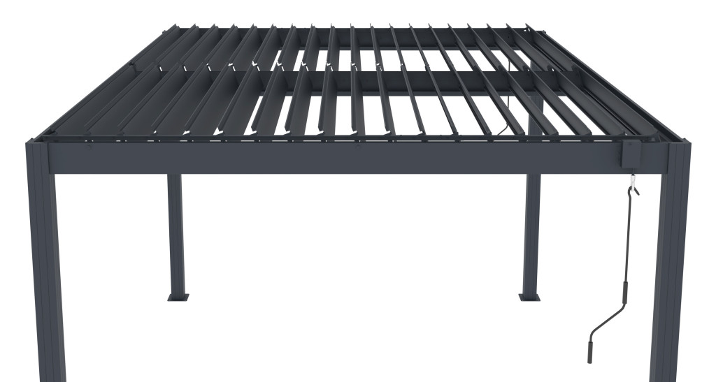 - Forgatható tetőlamellák az árnyék, a szellőzés vagy az eső elleni védelem manuális beállításához