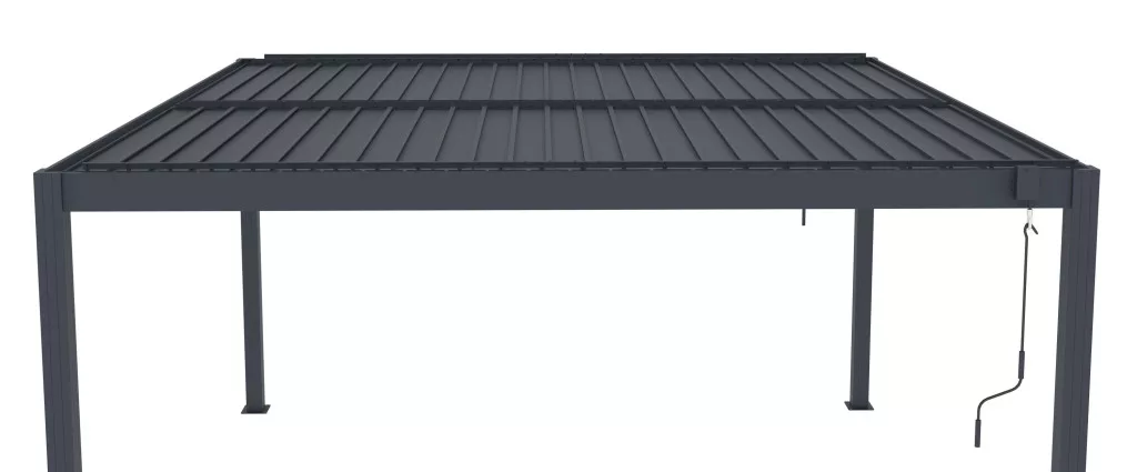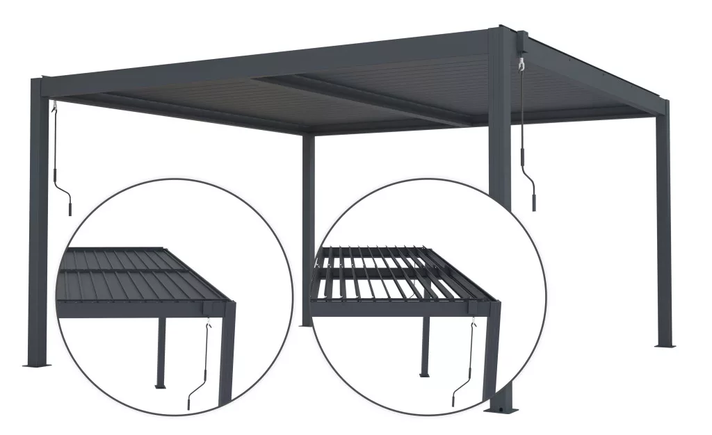 - Forgatható tetőlamellák az árnyék, a szellőzés vagy az eső elleni védelem manuális beállításához