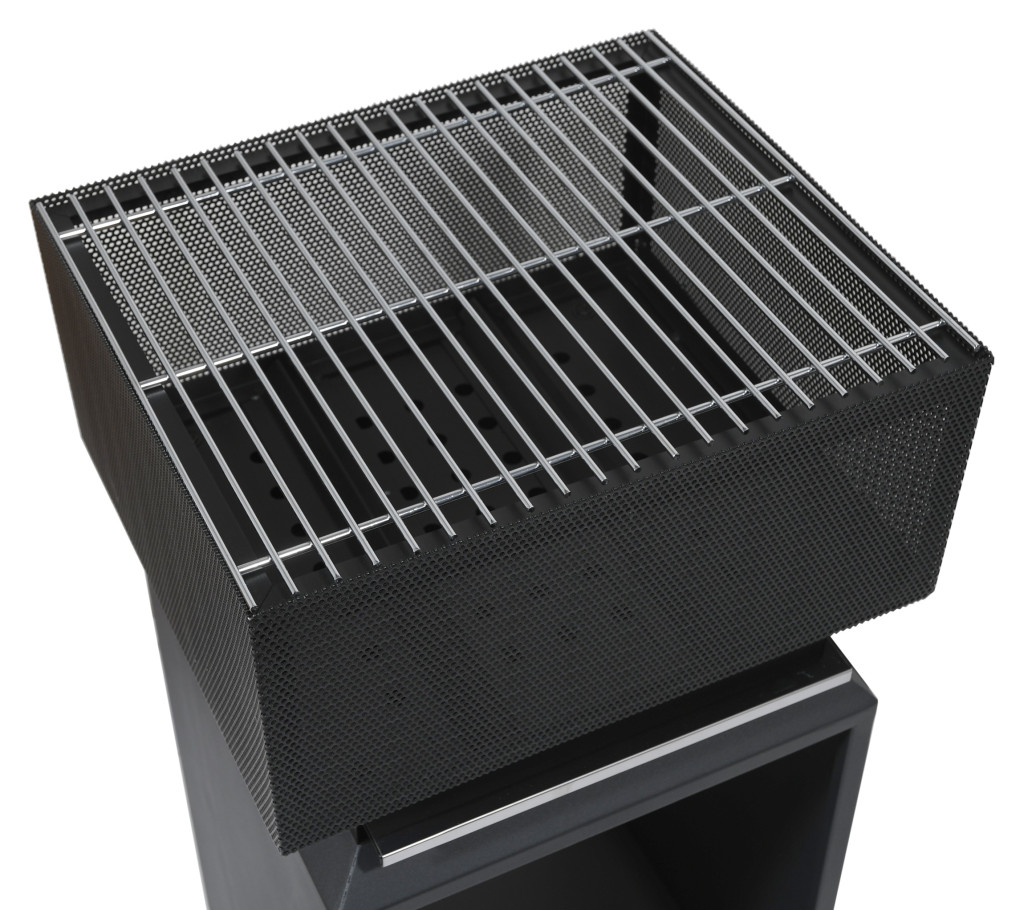 A tűztér szögletes szerkezete kiváló minőségű acélból készült, magas hőmérsékletálló fekete bevonattal. Oldalai perforáltak, és egyedülálló kilátást nyújtanak az égő tűzre. Az alsó részt tűzifa tárolására használja.