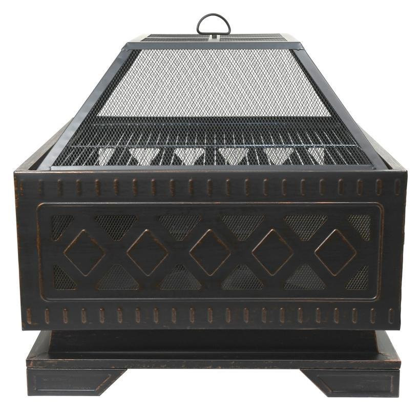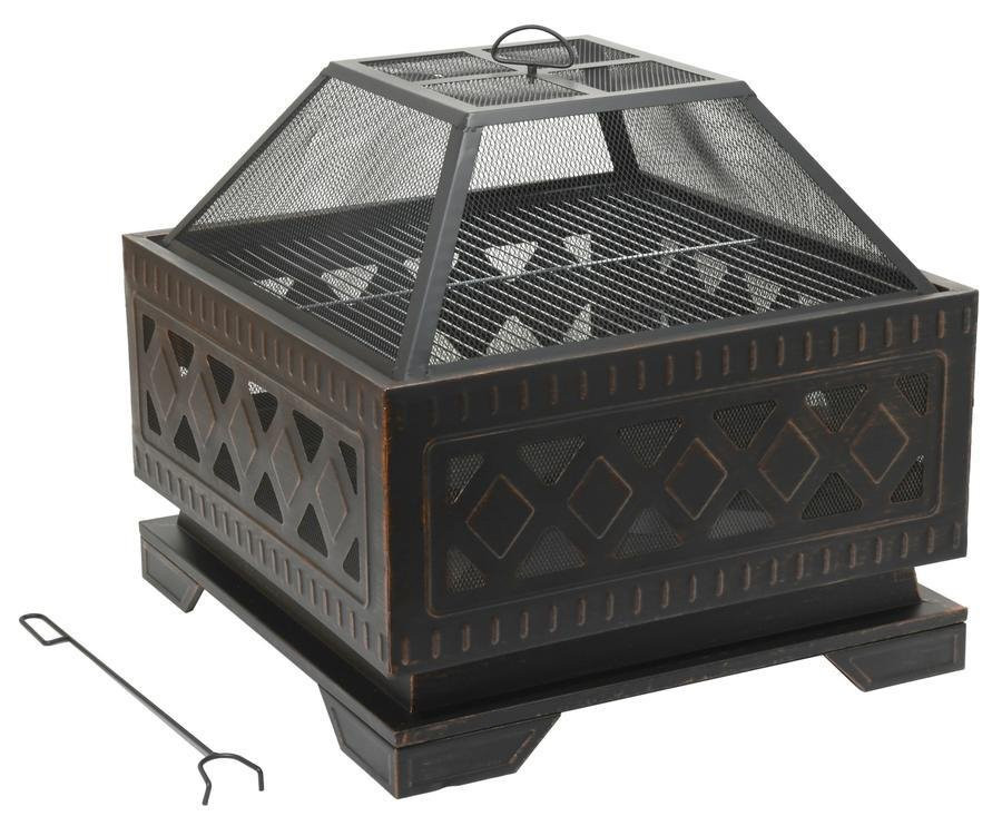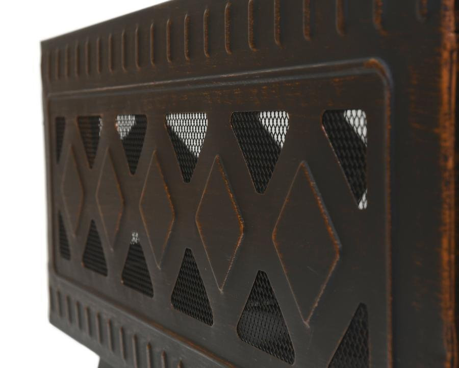 Hordozható kandalló, kiváló minőségű acélszerkezet, magas hőfokú patinás bevonat, erős és stabil díszített alap, acél grillrács, fedél a szikrák elleni védelemként.