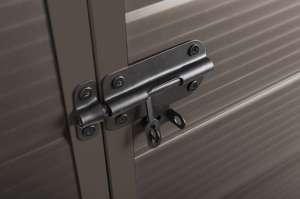 A kétszárnyú ajtó felett egy szellőző rács van elhelyezve, amely biztosítja a szellőzést és a légáramlást a ház belsejében. Ezért nem kell tartania penésztől vagy a falak vizesedésétől, amikor hirtelen változik a hőmérséklet.