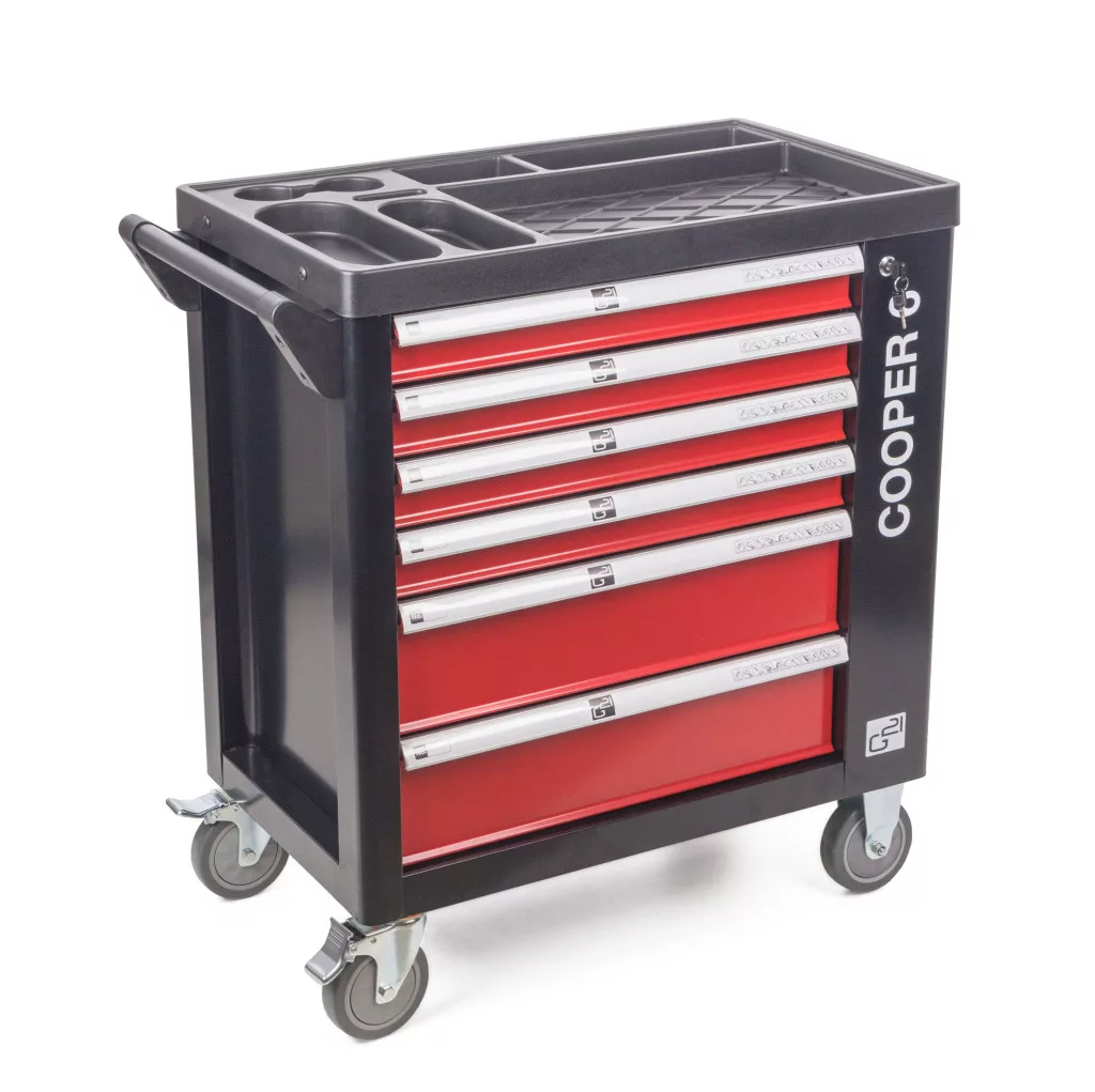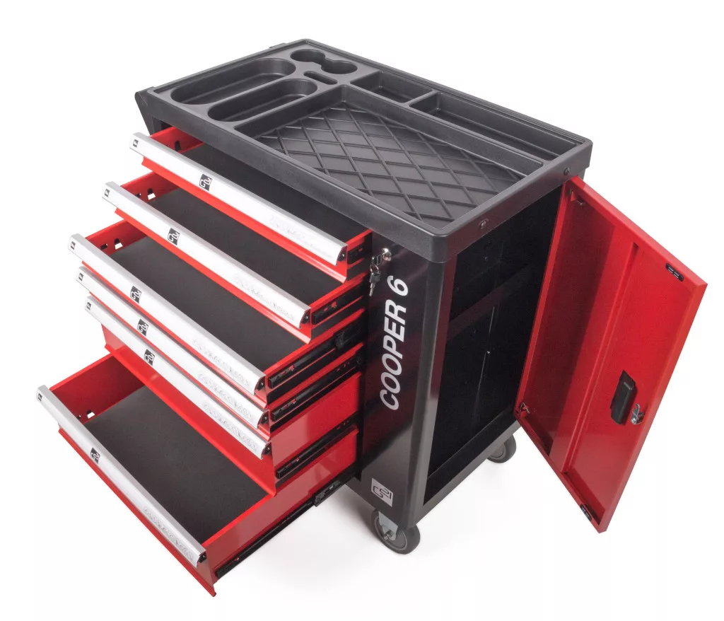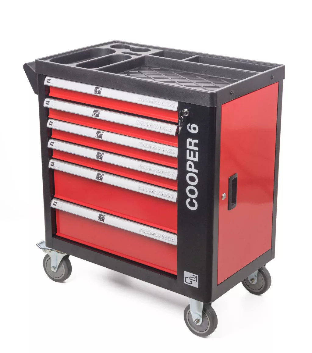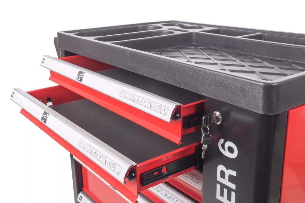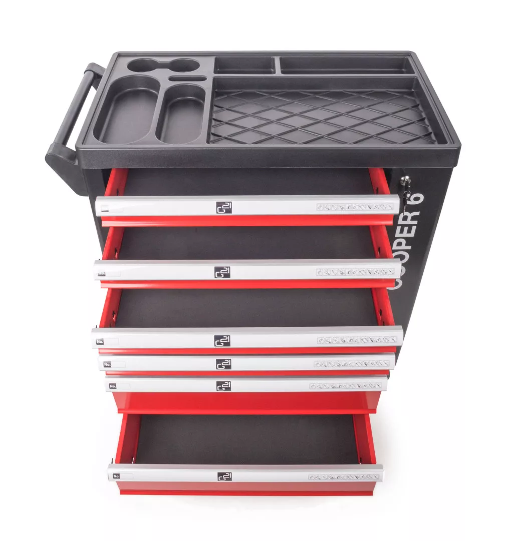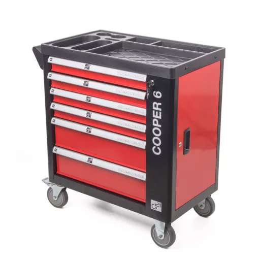 A G21 Cooper 6 műhelykocsit úgy terveztük, hogy a lehető legtöbb műhelyszerszám és tartozék elférjen benne. A hat belső fiókban és az oldalsó szekrényben helyet talál a csavarhúzók és fogók, fúrógépek vagy akkumulátoros szerszámok, valamint a tartozékok és más alapvető műhelyfelszerelések tárolására.