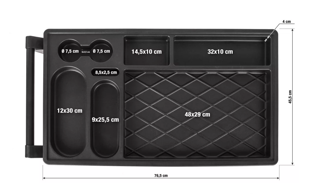 A teteje okos kialakításának köszönhetően a dolgokat a munkalapon tarthatja anélkül, hogy a kocsi mozgatásakor leesnének. A munkalapban süllyesztett rekeszek találhatók, amelyekben tárolhatja a leggyakrabban használt szerszámait, csavarokat és alkatrészeket, amelyeket kéznél kell tartania.