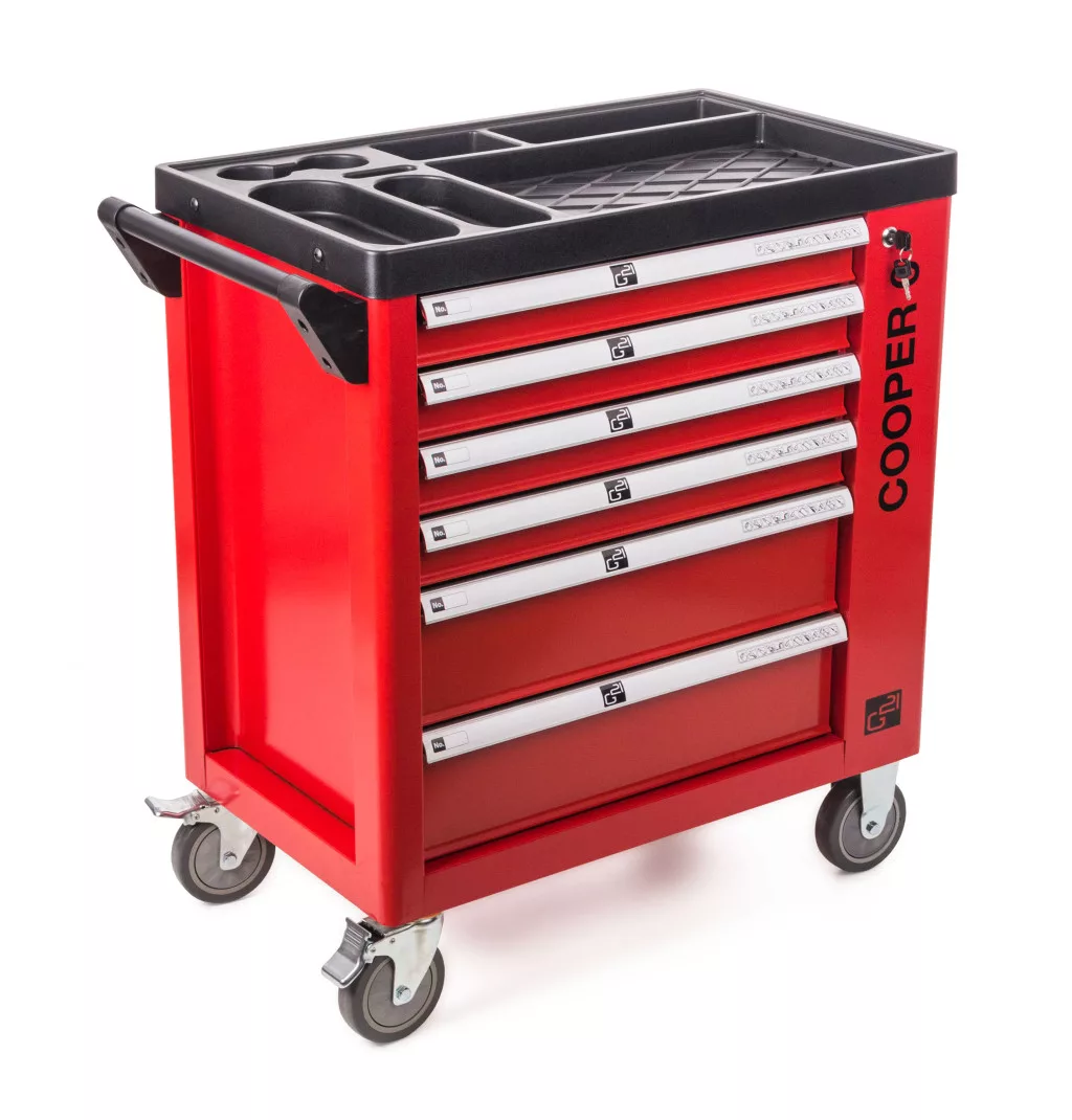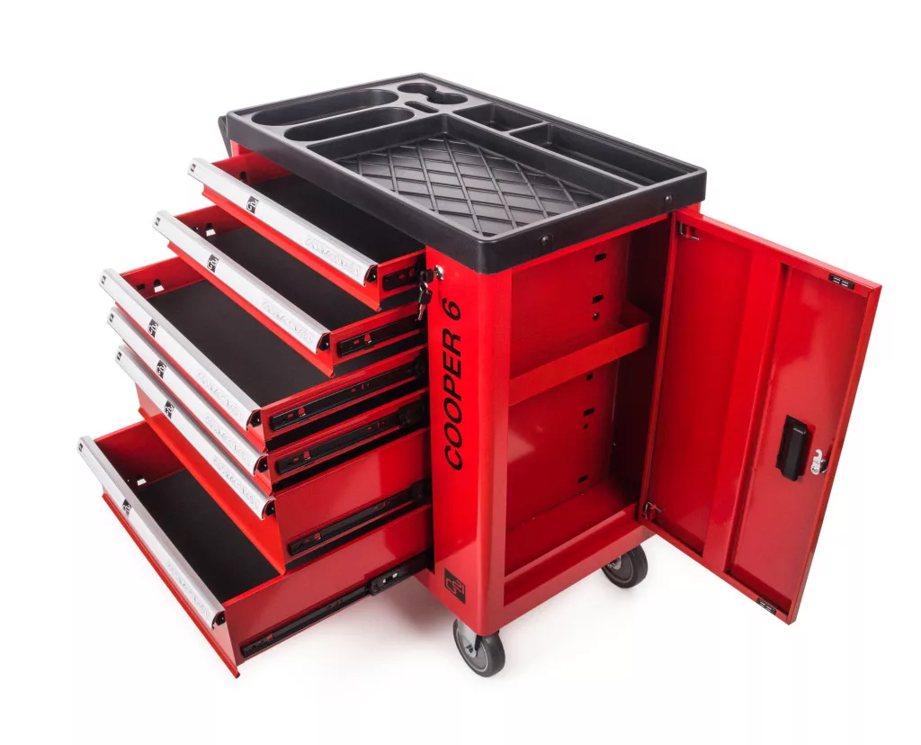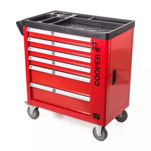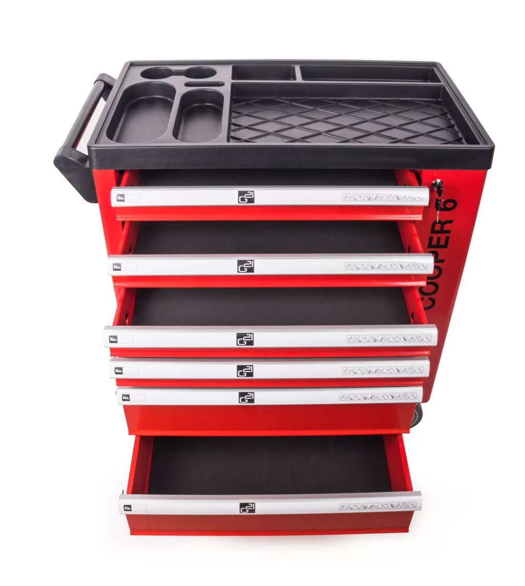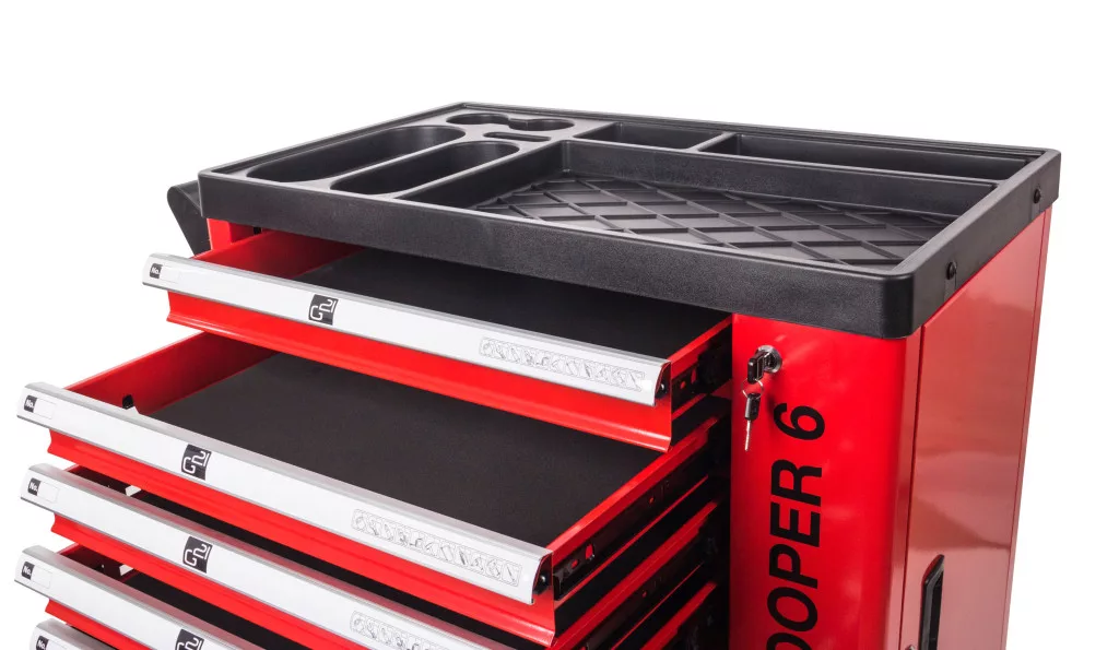 A G21 Cooper 6 műhelykocsit úgy terveztük, hogy a lehető legtöbb műhelyszerszám és tartozék elférjen benne. A hat belső fiókban és az oldalsó szekrényben helyet talál a csavarhúzók és fogók, fúrógépek vagy akkumulátoros szerszámok, valamint a tartozékok és más alapvető műhelyfelszerelések tárolására.
