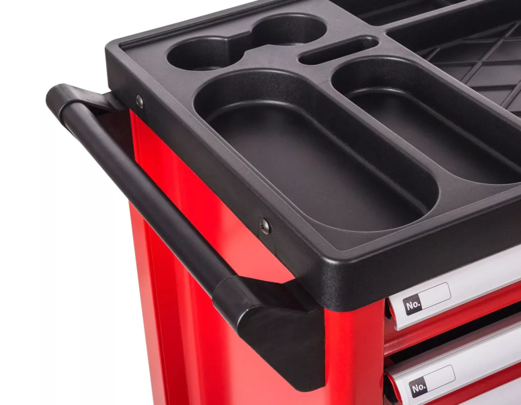 A teteje okos kialakításának köszönhetően a dolgokat a munkalapon tarthatja anélkül, hogy a kocsi mozgatásakor leesnének. A munkalapban süllyesztett rekeszek találhatók, amelyekben tárolhatja a leggyakrabban használt szerszámait, csavarokat és alkatrészeket, amelyeket kéznél kell tartania.