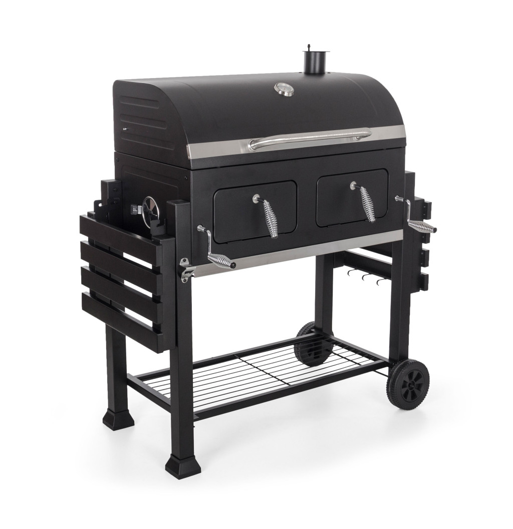 A grill alján található kerekek lehetővé teszik a grill könnyű kezelését és a kényelmes áthelyezését. A grill alsó felében méretes polc és a két oldalán még két acél polc található, amelyek lecsukhatóak. Szükség esetén odahelyezheti a grillező eszközöket vagy elkészített alapanyagokat.