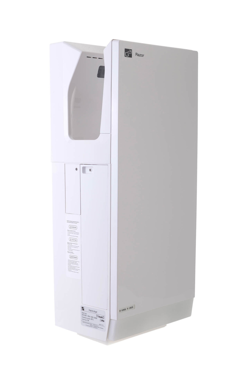 G21 Razor White kézszárító fehér kialakításban antibakteriális ABS műanyagból. 220 - 240 V AC feszültség, 50 / 60 Hz, 1000 - 1300 W teljesítmény. 75 - 100 m/s légáramlás gyorsaság (allítható), 10 - 15 másodperc alatt kiszárítja a kezeket.