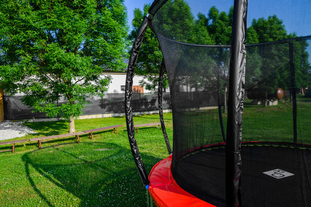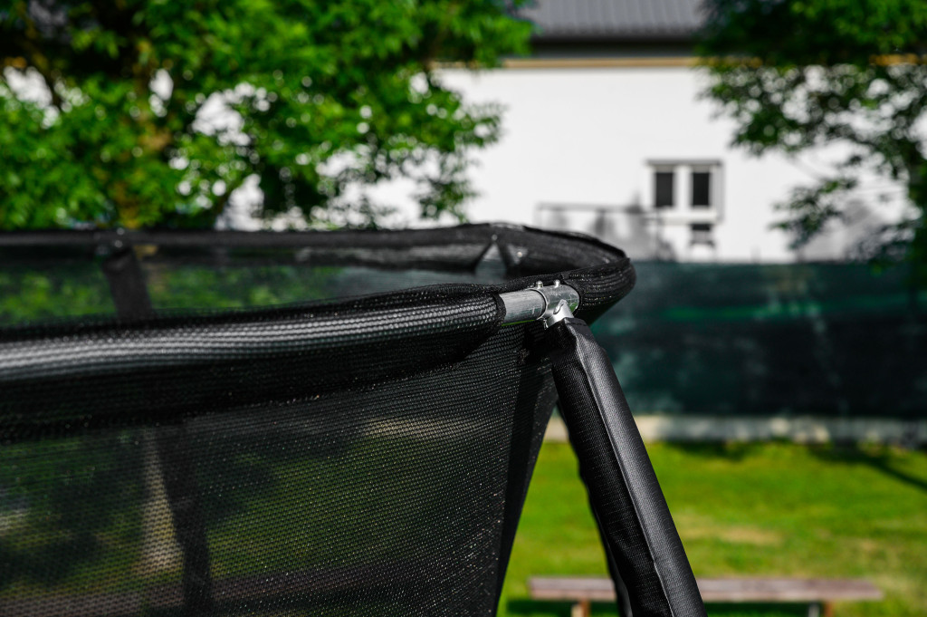 A trambulin védőhálója erős és sűrű szövésű. A biztonsági háló belülről van rögzítve a trambulin keretéhez.