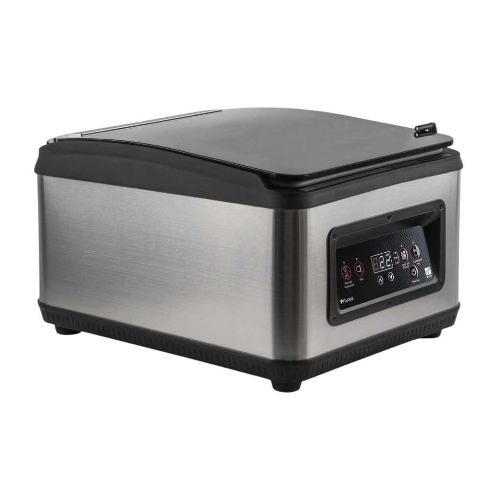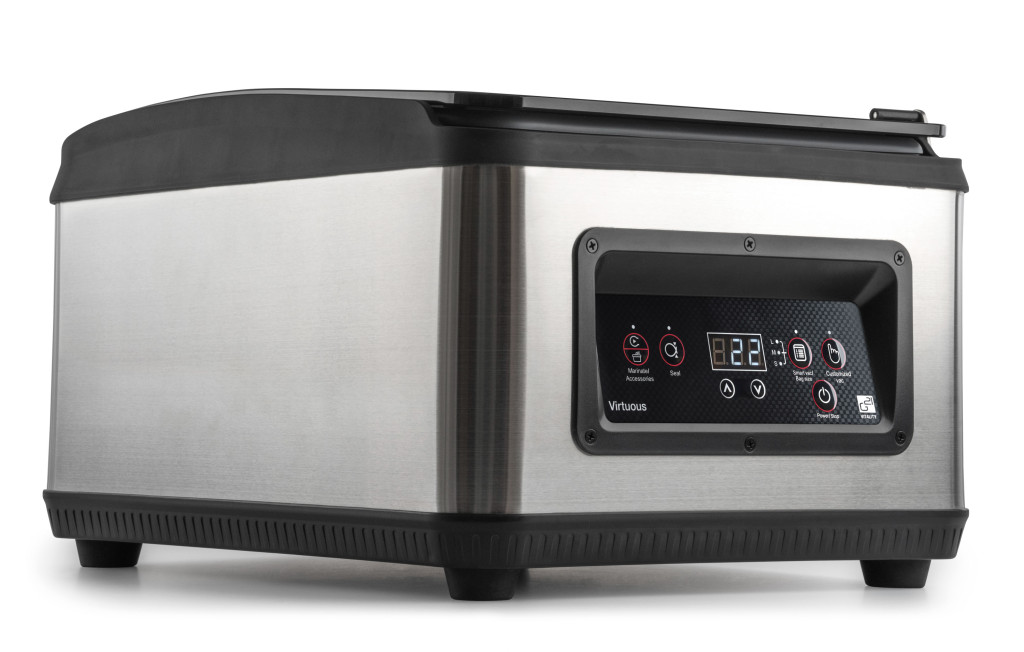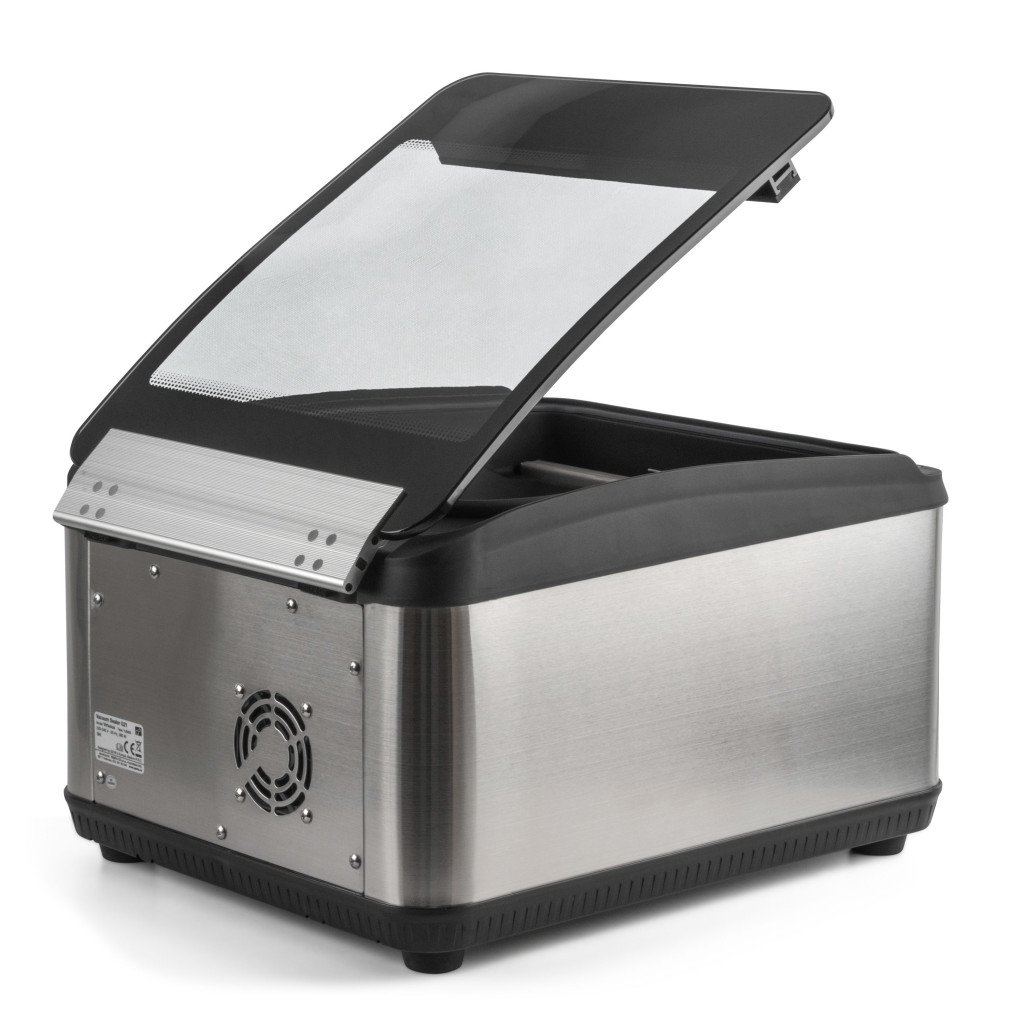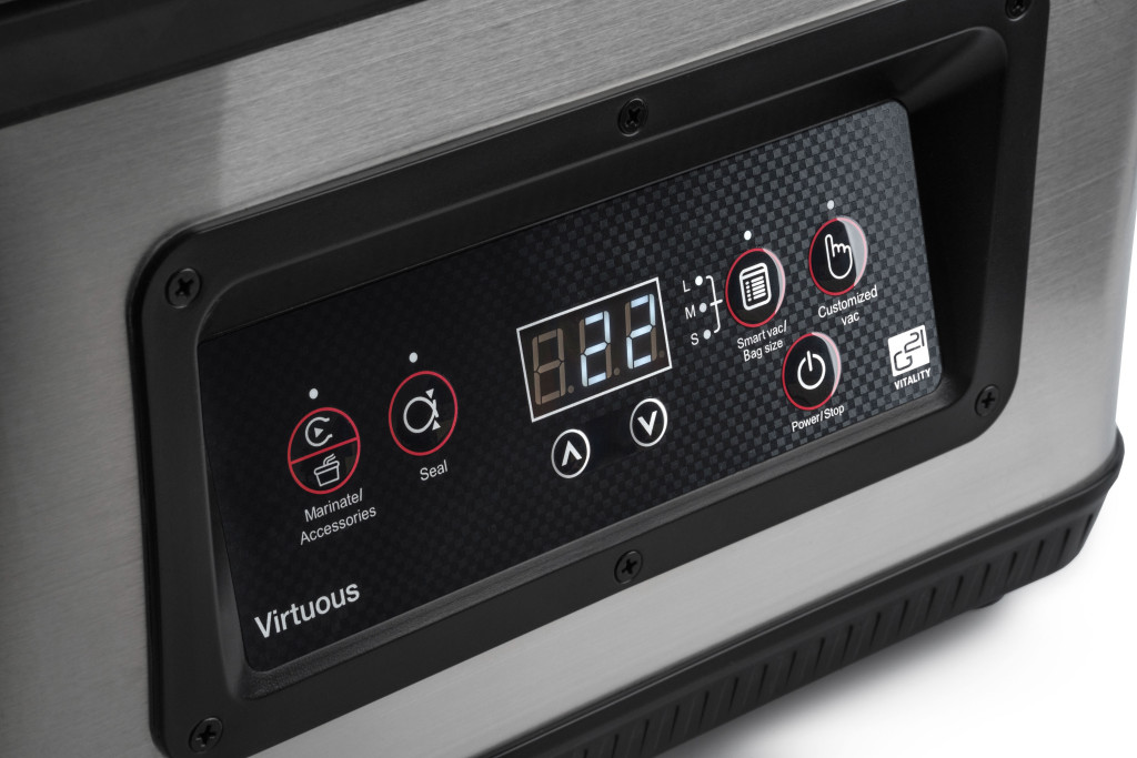 Intelligens vákuumozó kettős szivattyúval a szilárd és folyékony élelmiszerek megbízható vákuumozásához. Vagy a saját 6 literes vákuumkamrájában vákuumozod, vagy használhatsz vákuumtartályokat, konténereket és zacskókat vagy fóliát. Az egyedülálló G21 vákuum speciális funkciókkal is rendelkezik.