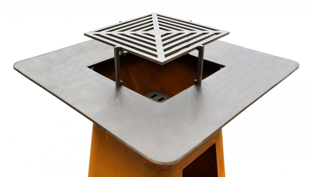 A grill felső része egy kihúzható hamutartóval ellátott kandalló ból áll, és a grill domináns jellemzője a hatalmas grillezési felület - plancha vastagsággal. 1 cm-es, enyhén a közepe felé döntve.