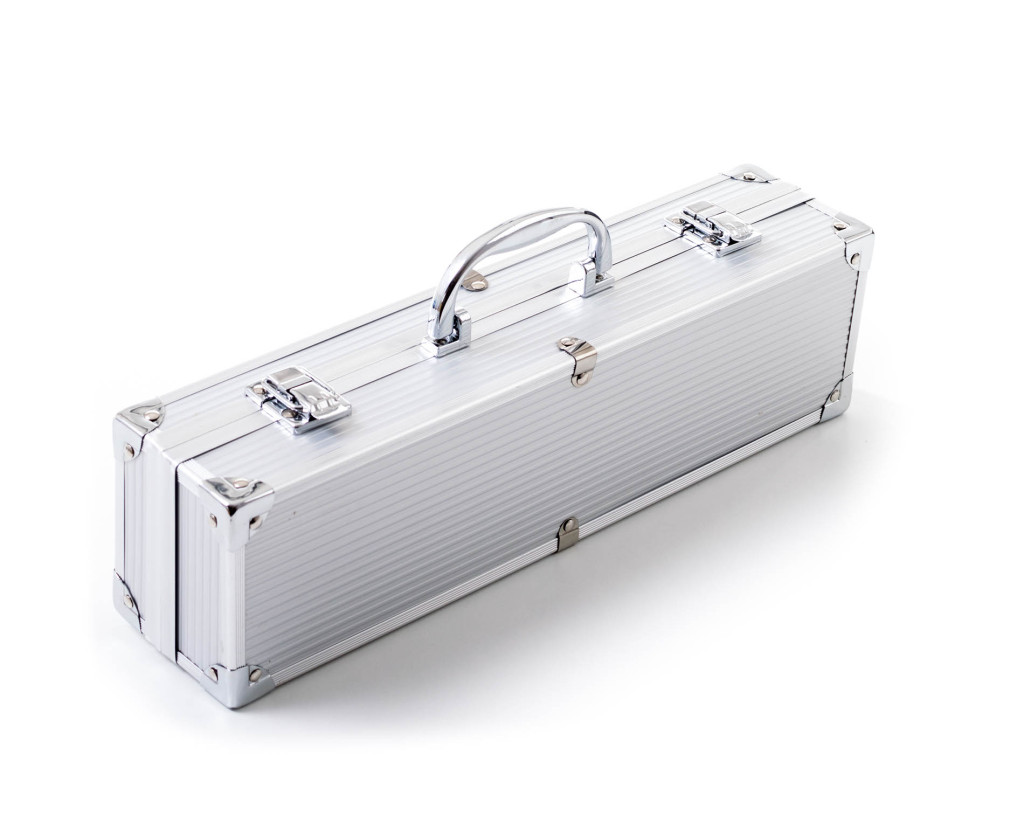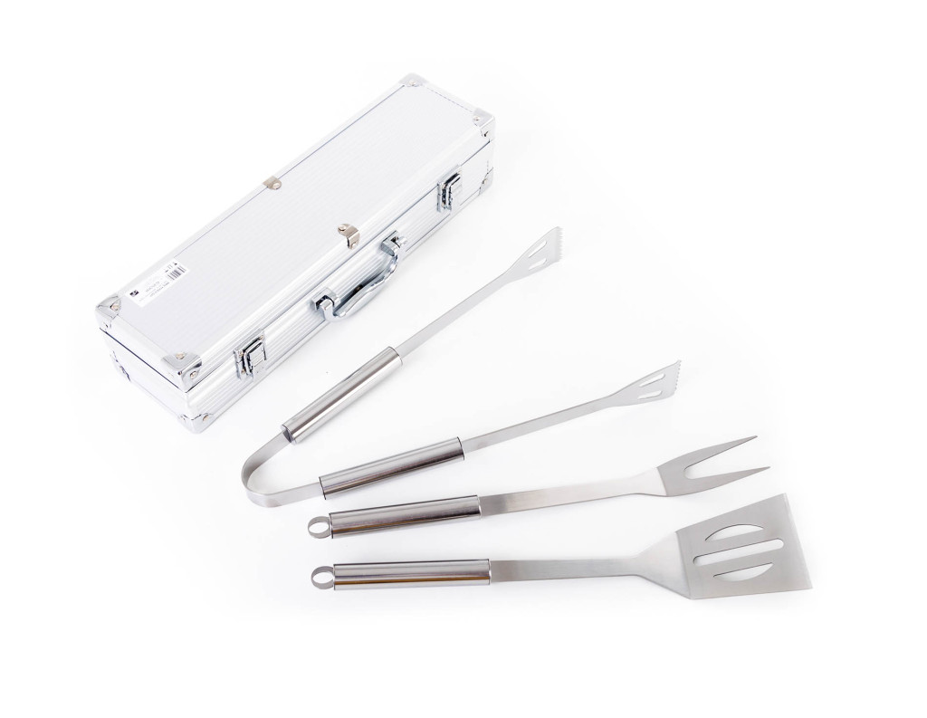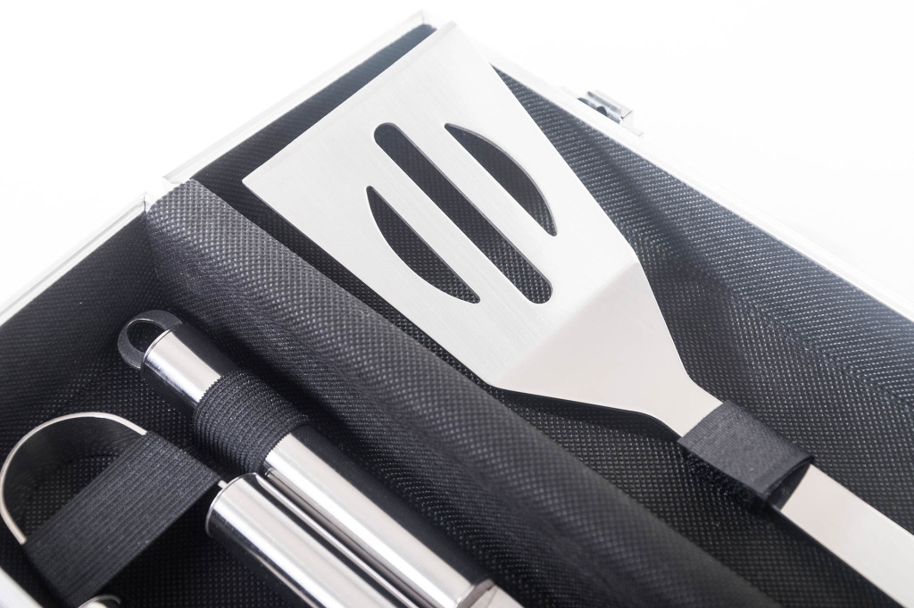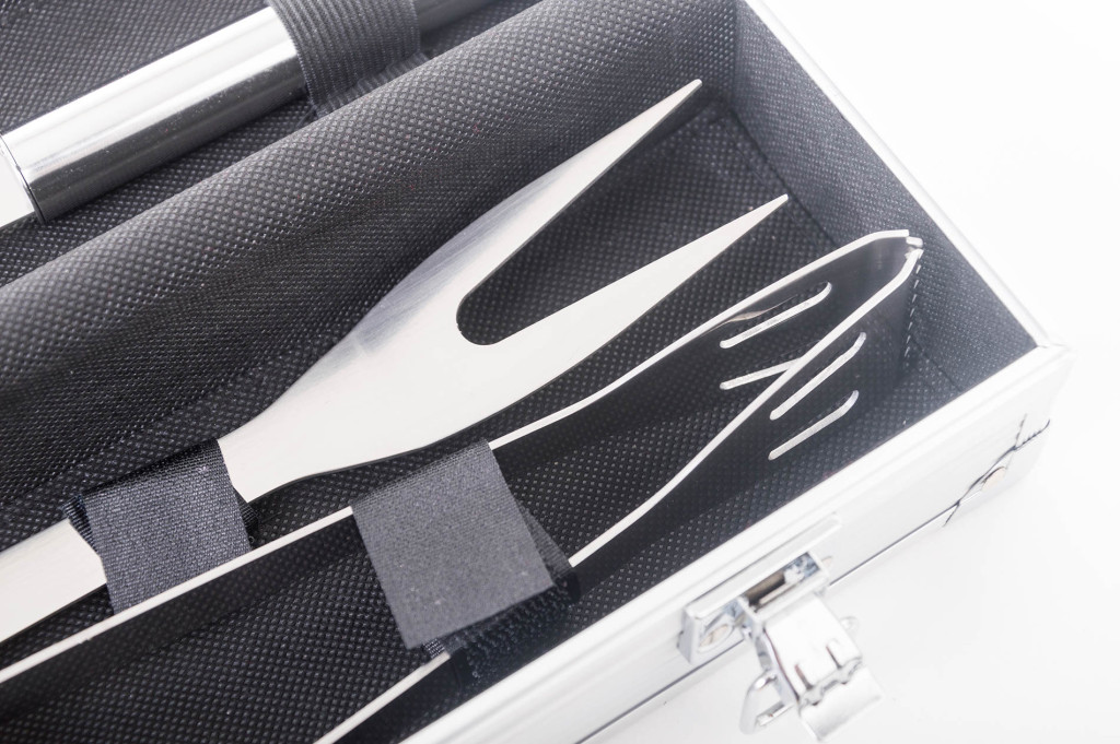 A készlet tartalmaz minden eszközt a gond nélküli grillezéshez. A készlet része egy 34 cm hosszú húsforgató, villa és csipesz. Az egyszerű áthelyezés és tárolás érdekében az eszközök egy praktikus alumínium bőröndbe vannak elhelyezve.