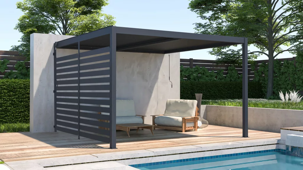 Ezzel a forgatható lamellás fallal teljes kontrollt szerezhet a kültéri környezet felett, és egész évben biztosíthatja a kényelmet és a magánszférát.