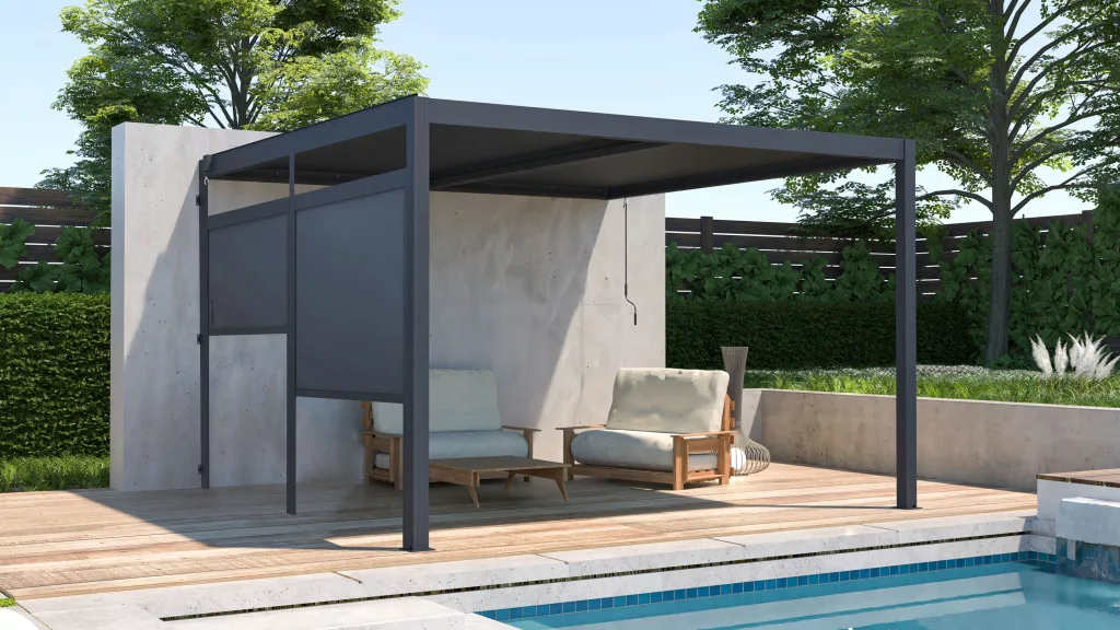 Az oldalsó napellenző kiváló megoldás azok számára, akik még jobban szeretnék a pergolájukat saját igényeikhez igazítani, és hangulatos kültéri pihenőhelyet kialakítani az év minden időszakában.