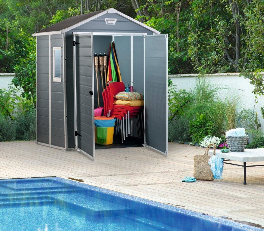 Szétszórva hevernek a kerti szerszámok a ház körül, és a garázsban már nincs hely? A Manor 6 x 5 kerti ház ideális méretű, és összeszerelése rendkívül egyszerű. A ház kiválóan alkalmas kerti szerszámok, de akár sporteszközök, medencetechnika, műhelyfelszerelés vagy grillezők – beleértve a nagyobb gázgrilleket is – tárolására.