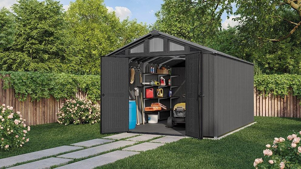 Szeretné bővíteni a tárolókapacitást? Szereljen fel polcokat a ház belsejében (nem tartozék). Ezeken kisebb eszközöket és tárgyakat tárolhat. Az ajtók extra szélesek, így a házba akár nagyobb grillezőt vagy fűnyírót is bevihet.