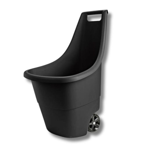 Kerti kocsi kerekeken beltéri és kültéri használatra, szilárd szerkezetű szintetikus gyantából, ellenáll az időjárásnak és az UV sugárzásnak, teherbírása 50 kg, térfogata 50 l, kis súlya 1,8 kg. Fekete színű.