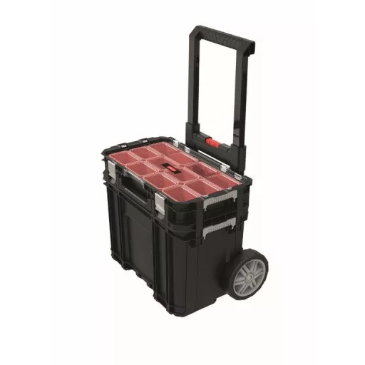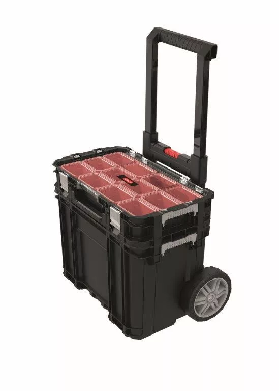Az ellenálló fém reteszek biztosítják a doboz erős lezárását. A tartalma így nem szóródik ki és biztonságban marad. A teleszkópos markolat és a gumis kerekek megkönnyítik a szállítását és a kezelhetőségét.