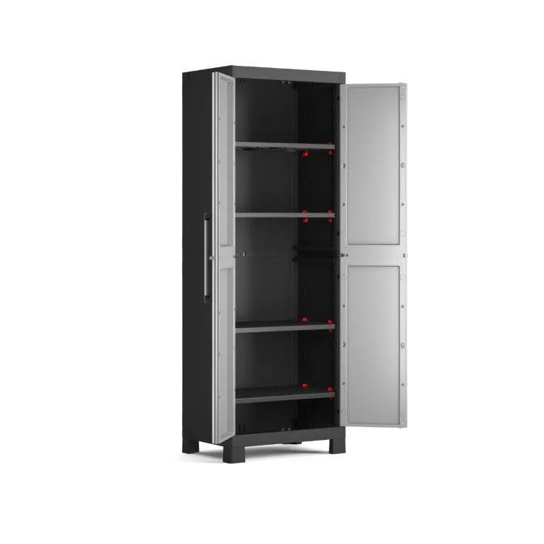 A karbantartásmentes Keter Detroit High tároló szekrényre magas ellenállás jellemző az időjárási hatásokkal és a mechanikus elhasználódással szemben, ezért használhatja kültéri és beltéri helyiségekben akadályok nélkül. Az univerzális szürke-fekete színű kialakításnak köszönhetően illeni fog minden térbe függetlenül a berendezés stílusától, és érvényesülhet például a háztartásban, a garázsban, a fészerben, a pincében, az erkélyen, a teraszon, a féltető alatt a kertben, vagy bárhol máshol, ahol épp szüksége van rá.