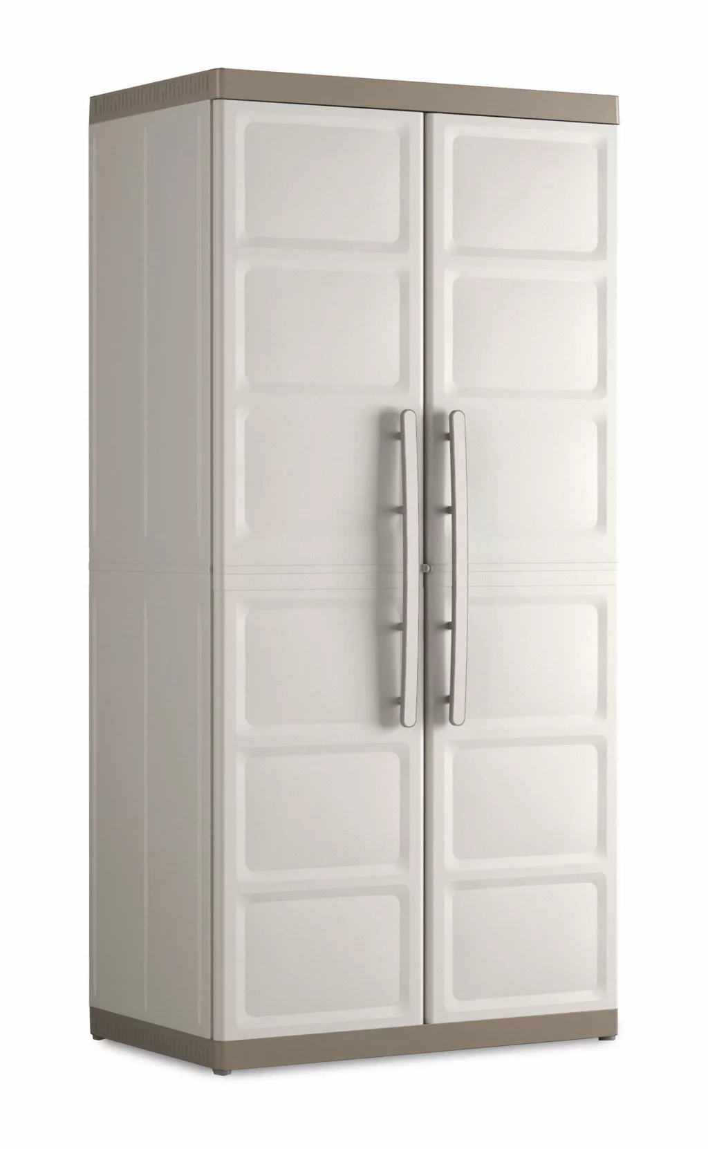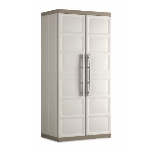 A karbantartásmentes Keter Excellence XL Utility tároló szekrény magas ellenállással a légköri hatásokkal és mechanikai elhasználódással szemben és lezárás lehetőségével használható háztartásban, garázsban, pajtában, pincében, tető alatt vagy bárhol máshol.
