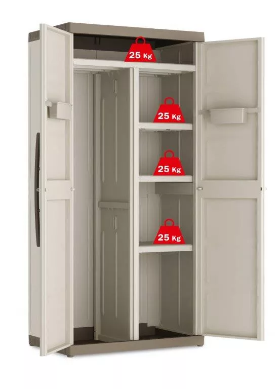 A szekrény 3 hozzáadott polccal rendelkezik - mindegyik 25 kg teherbírással, amelyek jól jönnek különböző nehéz tárgyakra. Használható szerszámok vagy kerti kellékek tárolására, jól jön hosszú nyelű szerszámok tárolására, amelyek máshova nem férnének be. Az univerzális bézs színének köszönhetően minden helységbe illeni fog függetlenül a berendezés stílusától.