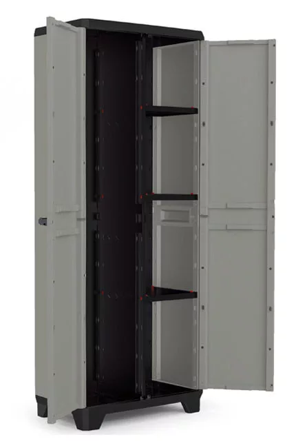 A szekrény 3 hozzáadott polccal rendelkezik - mindegyik 10 kg teherbírással, amelyek jól jönnek a nehezebb tárgyakra. Használhatószerszámok vagy kerti kellékek tárolására, jól jön hosszú nyelű szerszámokra, amelyek máshova nem férnének be. Az univerzális szürke színének köszönhetően beleillik minden térbe függetlenül a berendezés stílusától.