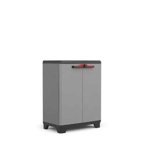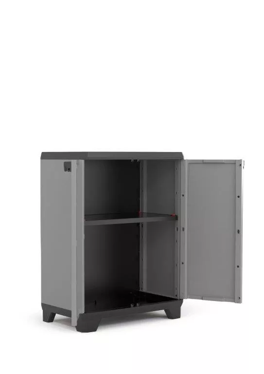 A Keter Stilo Low tárolószekrényt használhatja pincében, műhelyben, garázsban, fészerben vagy a verandán. A szekrény belsejében 1 polcot talál, amelyet szükség szerint elhelyezhet. Gond nélkül 15 kg-ig bírja. A szekrény összeszerelése nagyon egyszerű és gyors, körülbelül 10 percet vesz igénybe. Az ajtókilincseken lévő fix fülre lakatot helyezhet (nem tartozék), és reteszelheti a szekrényt. A lábak magassága tetszőlegesen beállítható a csavaros mechanizmus segítségével.