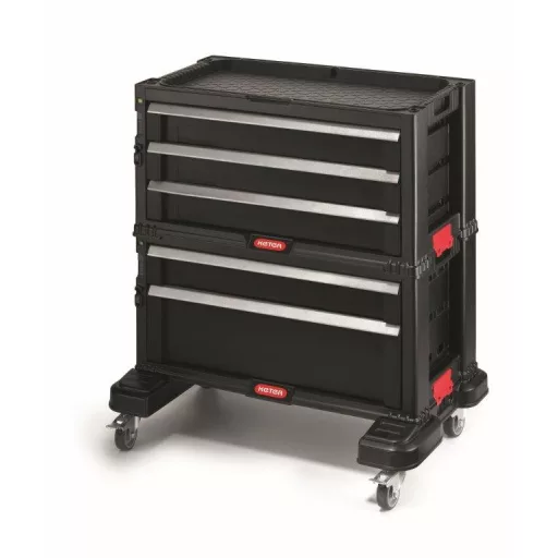 A műhelykocsi két különálló blokkbóláll, amelyek könnyen szétválaszthatók és külön-külön használhatók. Azegymásra rakható kialakítás lehetővé teszi a további fiókos blokkokhozzáadását és eltávolítását szükség szerint. A görgős alap is könnyen eltávolítható. Az első kerekek praktikus fékkel vannak felszerelve.
