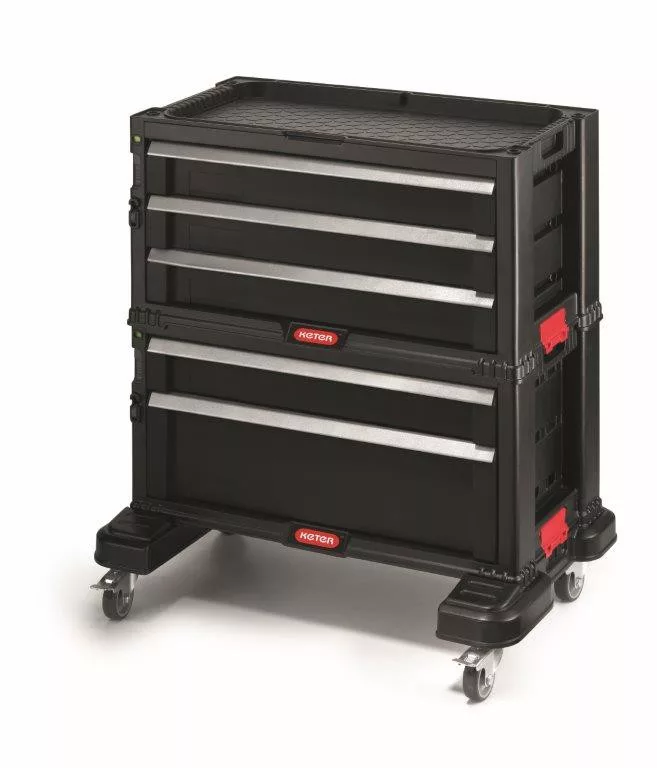 A Keter 5 fiókos műhelykocsi tárolóhelyet kínál számosszerszám, például csavarhúzó, fogó, fúró vagy akkumulátoros szerszám ésegyéb szerszámok és tartozékok tárolására. Erős és tartós műanyagbólkészült.
