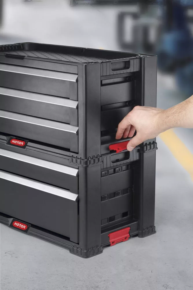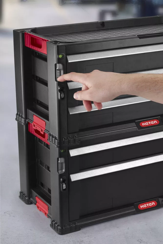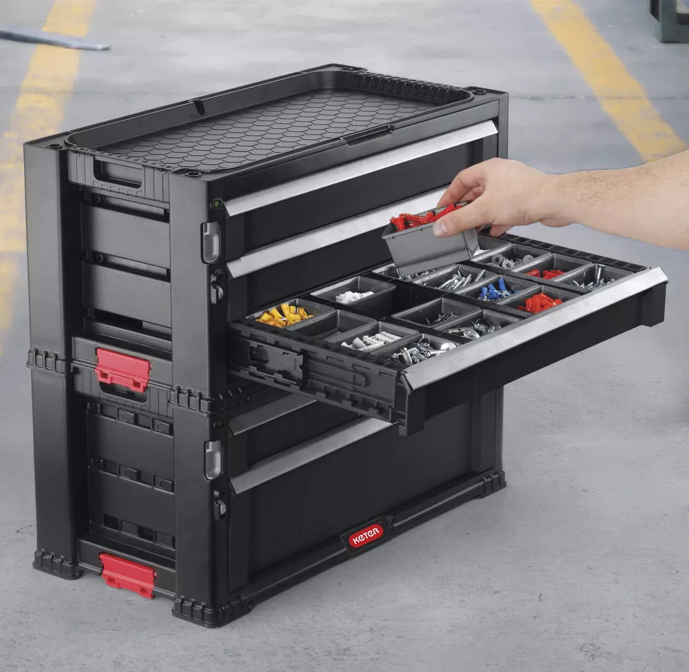 A szerszámtároló doboz egy mély fiókottartalmaz kivehető rekeszekkel, amelyben nagy és nehéz szerszámokat istárolhat. A másik 4 fiók kisebb szerszámok és tartozékok tárolásáraszolgál. A négy kisebb fiók egyike 16 kivehető rendszerzővel van felszerelve az apró tartozékok egyzserű válogatását elősegítve - méretek és típusok szerint. A fiókok összes válaszfala könnyen eltávolítató, így szabad hely marad a nagyobb szerszámok számára. Minden fiókos blokk beépített tolózárral biztosítható. Van egy hurok is a lakattal való rögzítéshez.