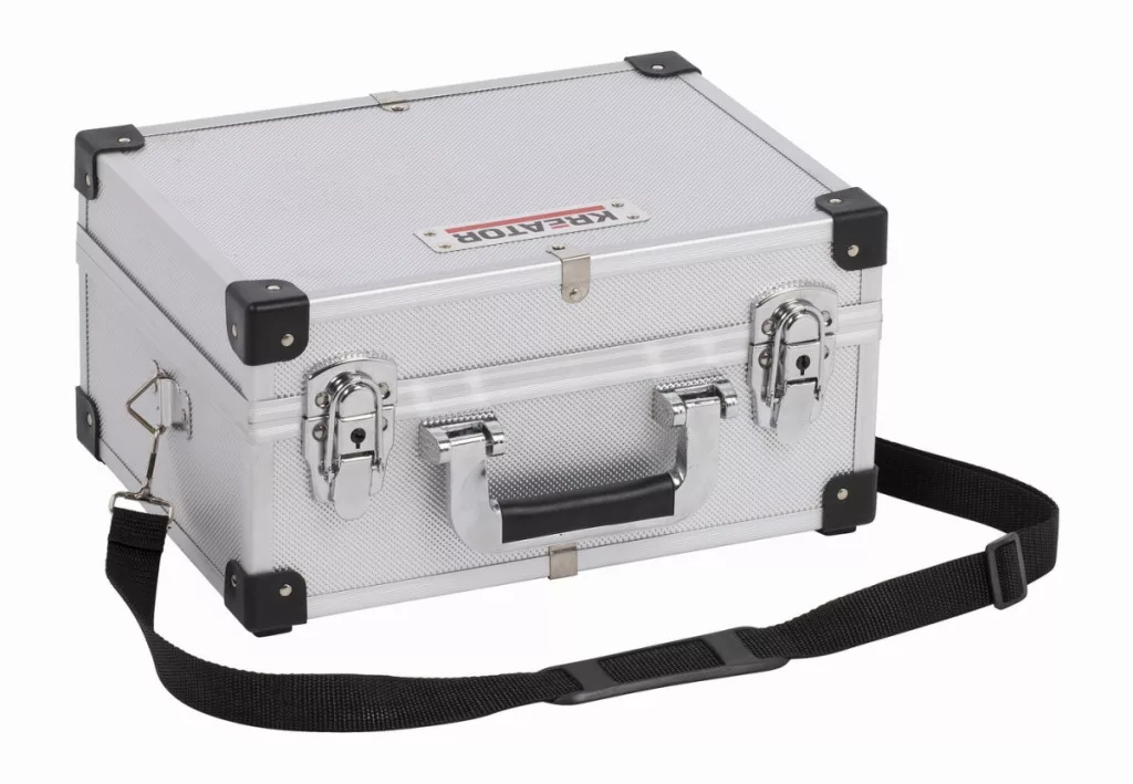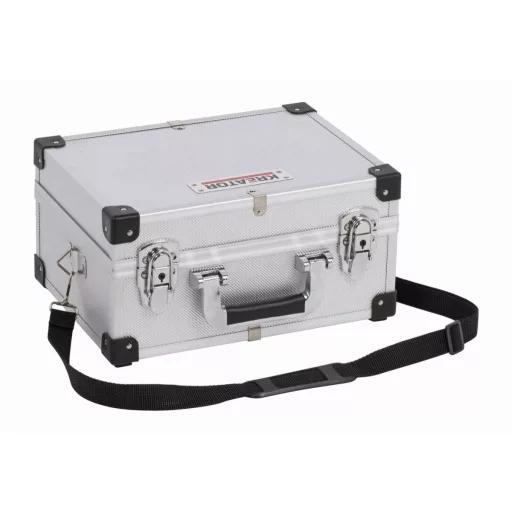 A fekete és ezüst színű KRT640106S alumínium koffer a Kreator márkától 320 x 230 x 160 mm méretekkel rendelkezik. Az erős doboz párnázott,rekeszek nélkül, így könnyen tárolhat benne nagyobb szerszámokat is.
