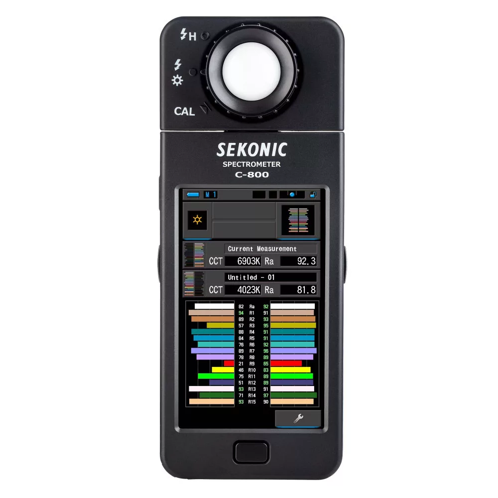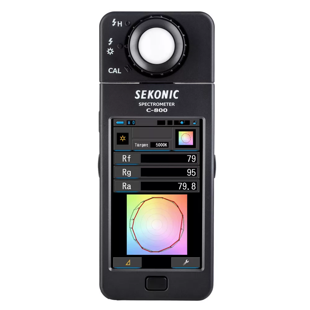 A Sekonic C-800 expoziméter tökéletes megoldást kínál amatőr és profi fotósoknak, operatőröknek és világítástechnikusoknak, akik pontos pontszerű mérést szeretnének végezni a jelenetet megvilágító fényforrásokról ambient fényviszonyok mellett. A 99 mérési adat tárolása mellett a készülék bármilyen fényforrás mérésére alkalmas, legyen szó LED-ekről, vakukról, HMI lámpákról, halogénekről vagy természetes napfényről. A lineáris CMOS szenzor 300–780 nm hullámhossztartományban dolgozik, és 1–200 000 lux (0,09–18 600 fc) fényerőt, valamint 1 600–40 000 K színhőmérsékletet mér.
